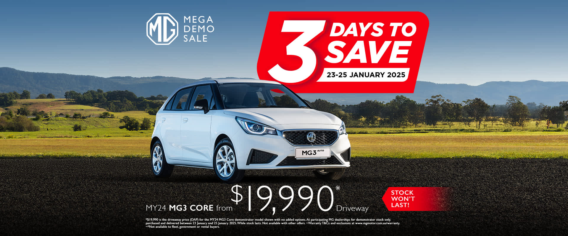 *$19,990 is the drive away price (DAP) for the MY24 MG3 Core demonstrator model shown with no added options. At participating MG dealerships for demonstrator stock only, purchased and delivered between 23 January and 25 January 2025. While stock lasts. ~Warranty T&Cs and exclusions at www.mgmotor.com.au/warranty.~*Not available to fleet, government or rental buyers.